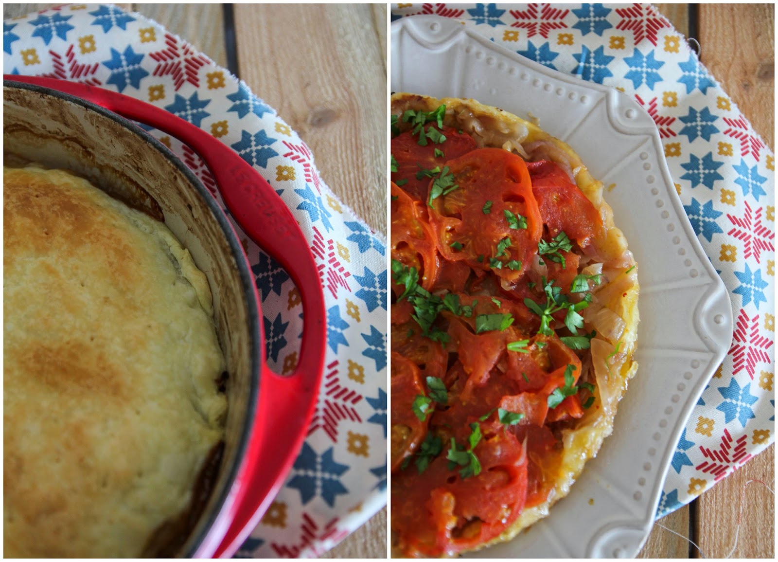 Quando pensamos em tarte tatin, lembramo-nos logo da versão original, feita com maçãs (ou outra fruta: no blog encontram duas sugestões - pêssego e ameixa). Mas a verdade é que também podemos fazer tartes salgadas seguindo a mesma técnica: a de cozer a massa virada para cima. E foi com uma versão salgada que estreei a minha sertã (sertã ou tarteira? não sei bem que nome lhe dar), dando uso aos primeiros tomates frescos da época.